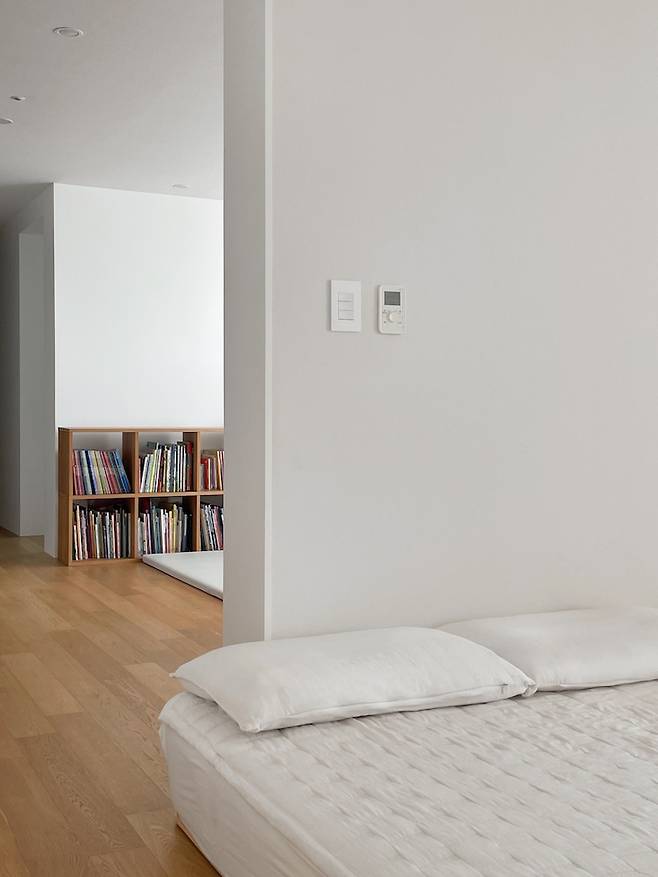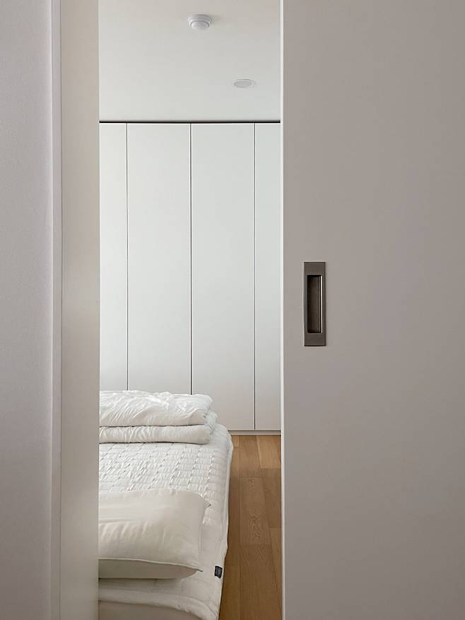 온 가족이 함께 자는 곳이라 퀸 사이즈, 슈퍼싱글 사이즈 매트리스를 두니 공간이 조금 부족한데 슬라이딩 도어를 설치한 덕에 문제없이 배치할 수 있었답니다.