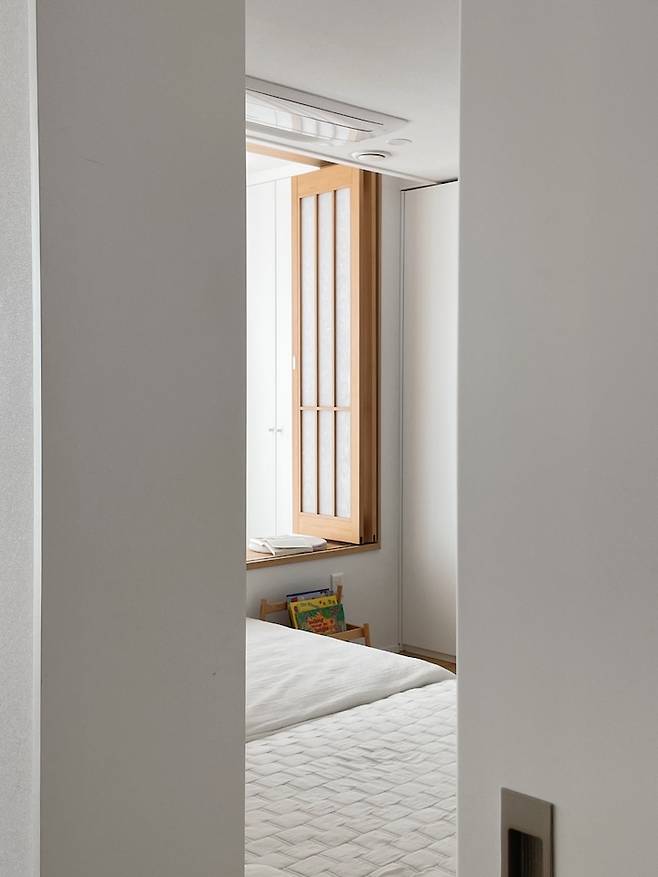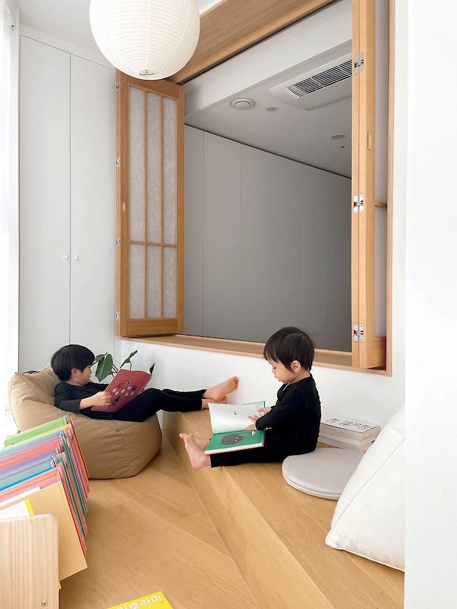 제 바람대로 아이들은 창문으로 열심히 넘어 다니고 있어요. 이쪽으로 들어오는 걸 더 좋아해요. 집에 문의 종류가 다양하니 아이들이 드나들 때마다 문 여닫는 재미도 느끼는 것 같고요. 창틀에 앉아서 책을 읽거나 휴대폰을 보면서 쉬기도 해요. 꼭 한옥 툇마루에 걸터앉은 것처럼 고즈넉한 느낌도 느낄 수 있답니다.