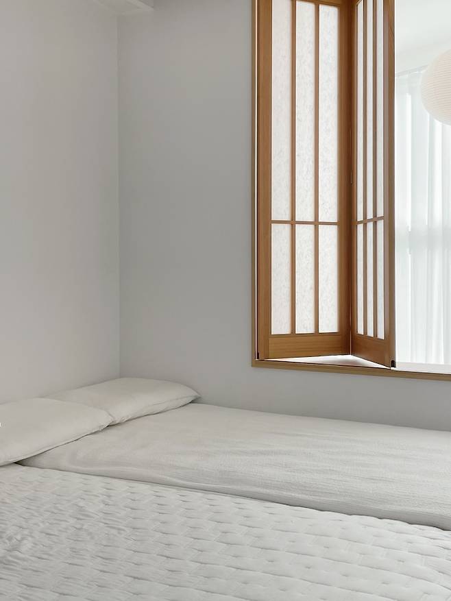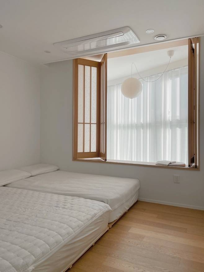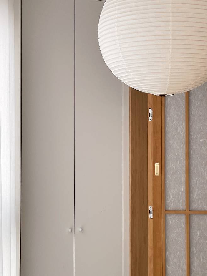 안방에서 베란다로 이어지는 창에는 한지창의 루버셔터를 설치했어요. 전부터 한옥에 대한 로망이 있어서 집에 한국적인 요소를 담고 싶다는 생각을 했었거든요. 한옥문처럼 미닫이문을 할까 했었는데 창틀 공간이 넉넉해서 문을 완전히 접어두고 앉아있으면 더 좋을 것 같아 루버셔터를 설치하게 되었습니다.