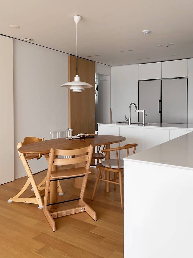 거실은 가족들이 가장 많은 시간을 보내는 공간이라 어떻게 꾸며야 할지 고민이 많았어요. 아무 장식이 없는 깔끔한 공간으로 만들고 그 안에 우리 가족의 이야기를 채워나가야겠다고 생각했습니다.