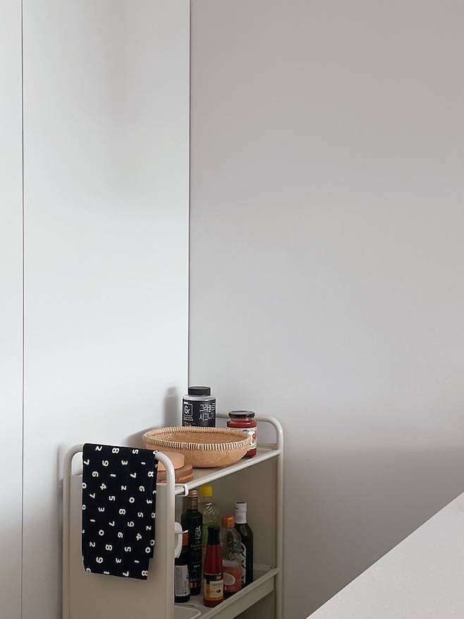 하부장에 양념칸이 있긴 하지만 키가 큰 양념통은 들어가지 않아서 북카트에 올려두고 사용하고 있어요. 실온 보관하는 재료들도 올려두고요. 요리하는 데는 동선이 생명인데 카트를 두는 것만으로도 정말 편해졌어요.