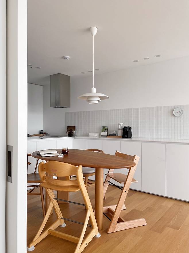 주방은 제가 가장 많이 사용하는 곳이라 특히 신경을 많이 썼어요. 인테리어하면서 가장 골머리를 앓았던 곳이예요. 원래는 평범한 일자형 주방이었는데 상부장이 없는 대면형 주방을 꼭 갖고 싶었어요. 아이들이 노는 모습을 보면서 요리하고 싶었거든요. 공간이 넓지 않아서 구조상 어려운 부분이 많았지만 우여곡절 끝에 원하던 느낌의 주방을 만들 수 있었어요.