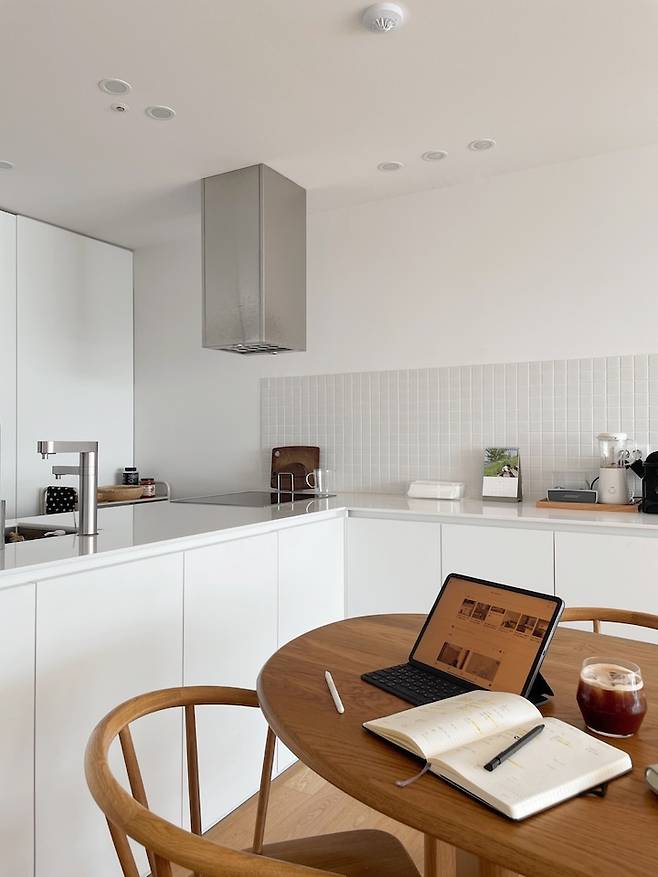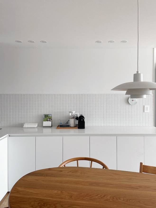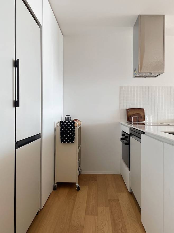 원래는 벽에 선반을 달아볼까 고민하기도 했지만 저는 아무것도 없는 멀끔한 벽이 좋더라고요. 수납이 딱히 더 필요하지도 않았고요. 그래서 조금은 심심해 보이지만 깔끔한 모습으로 주방을 쓸 수 있는 것 같아요.