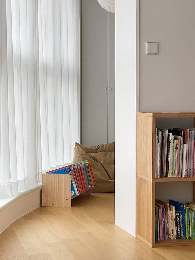 특이한 점이라면 거실과 안방 베란다에 라운드 형태의 커튼 월이 있다는 거였어요. 집을 보자마자 이 부분을 좀 더 재미있게 활용해 보면 좋겠다는 생각이 컸고, 아이들이 즐겁게 지낼 수 있는 공간을 만들어보고 싶었어요.