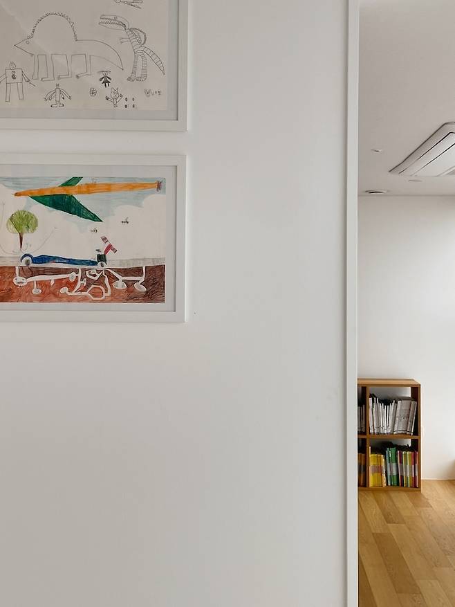 벽에는 첫째가 그린 멋진 그림을 걸어두어 전시공간으로 쓰기도 하고 가끔 아이들을 재워놓고 저희 부부끼리 한 잔 기울이기도 해요. 쓰임이 없던 베란다를 활용한 덕에 저희 집만의 독특한 공간을 갖게 된 것 같아요.