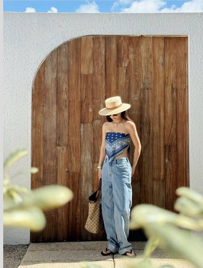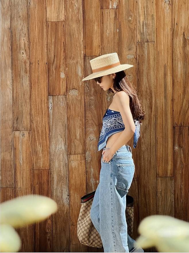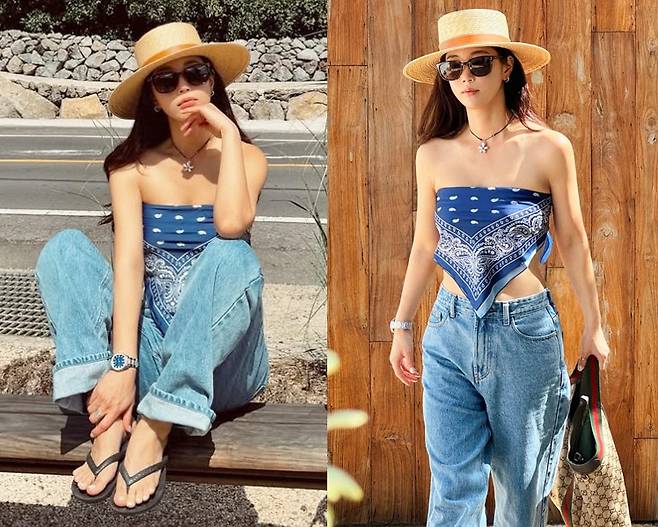 기은세는 블루 반다나를 튜브톱으로 연출해 과감하면서도 청량한 분위기를 드러냈습니다.