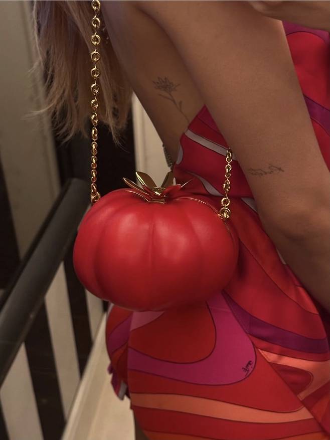 리사는 붉은 계열의 패턴이 인상적인 홀터넥 탑과 쇼츠를 선택해 마치 원피스 또는 하의실종 패션인 듯한 착시를 연출했습니다.