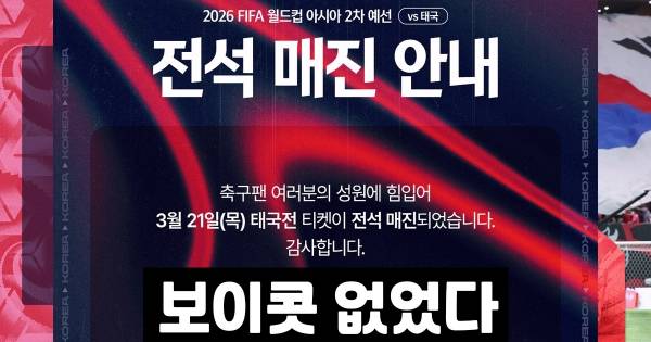 대한축구협회가 방금 태국전 전석 매진 소식을 전했다.