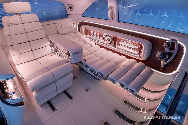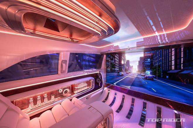 실내에는 디지털 계기판과 센터 및 조수석 디스플레이, 접이식 65인치 4K 디스플레이, 42스피커 돌비 애트모스 서라운드 사운드 시스템, 전 좌석 전동 시트, 접이식 테이블, 등이 적용됐다. 유리 칸막이는 투명도 조절이 가능하며, 디스플레이로 활용할 수 있다.