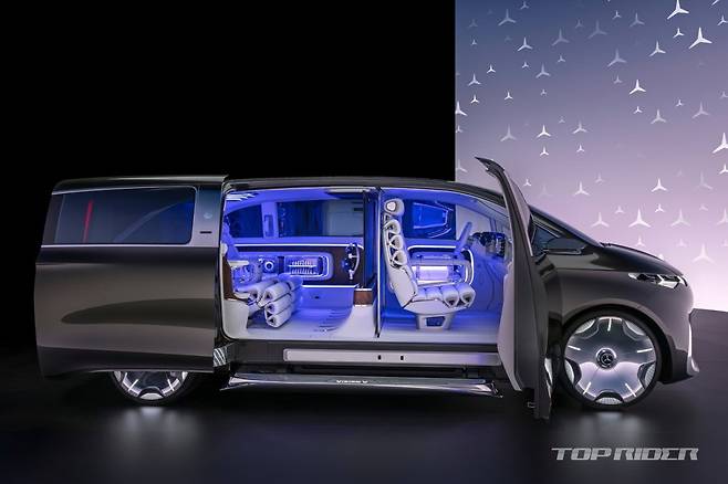벤츠는 비전 V(Vision V) 콘셉트를 22일 공개했다. 비전 V 콘셉트는 벤츠의 차세대 전기차 전용 플랫폼 VAN.EA 기반 미니밴으로 새로운 디자인 언어가 반영됐으며, 실내는 다양한 고급 사양을 탑재했다. 비전 V 콘셉트는 2026년 양산이 예정됐다.