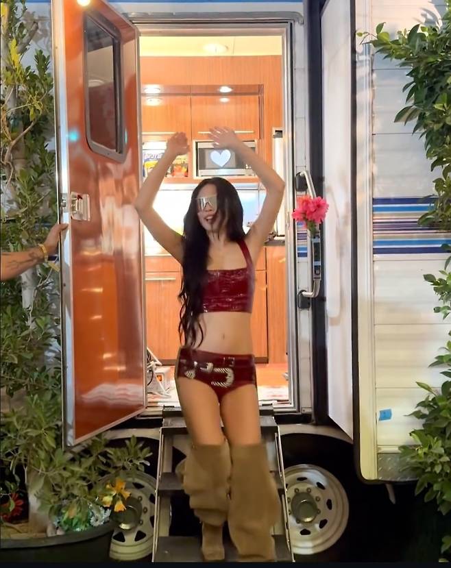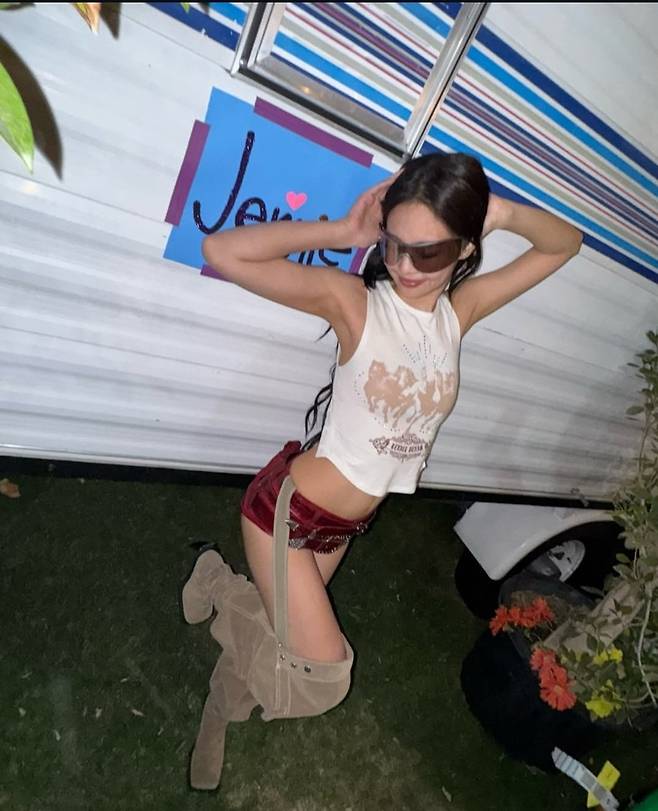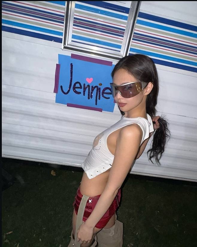 대형 미러 선글라스를 쓴 채 여유롭게 포즈를 취하는 제니의 모습은 "역시 갓제니"라는 감탄을 불러일으켰습니다.
