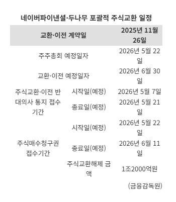 두나무의 현금 동원 여력에 비해 1조2000억원 한도가 지나치게 보수적이라는 지적도 일고 있다. 한도를 초과할 경우 추가 이사회 결의를 거쳐야 하는데, 이는 거래일정에 차질을 빚거나 조건 재협상으로 이어질 수 있다. 주주총회는 내년 5월 22일로 예정돼 있으며, 주식교환일은 같은해 6월 30일이다. 매수청구권 행사 규모가 한도를 크게 초과할 경우 일정에 차질을 빚을 수 있다.