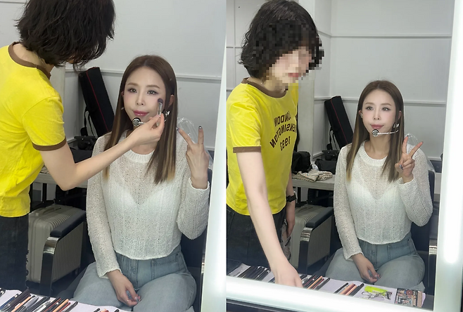 메이크업 브러시의 섬세한 터치가 스쳐 가는 동안에도 카메라를 향해 짓는 미소는