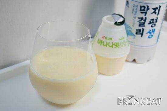 다음은 바나나 우유. 단지형 바나나 우유의 달콤한 향을 맡고 나니 이것이 과연 막걸리와 잘 어울릴까 두려운 마음이 앞섰지만 조심스레 바나나 우유 막테일을 만들어 봤다. 비율은 마찬가지로 1:1. 꿀은 넣지 않았다.