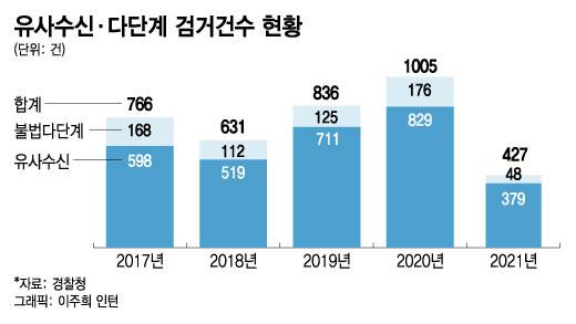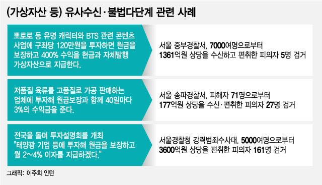 김씨 사례와 같이 코인 등 가상자산을 이용한 유사수신·불법 다단계 사건 검거건수와 인원이 늘었다. 경찰의 단속에도 불구하고 조직적으로 사기행각을 벌이는 탓에 대규모 피해자가 발생하고 가상자산의 특성상 추적이 어려워 수사하는 데 오랜 시간이 걸린다.