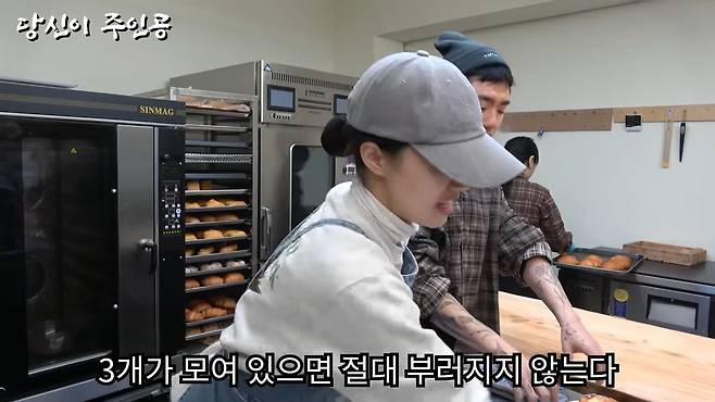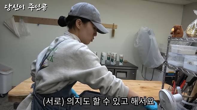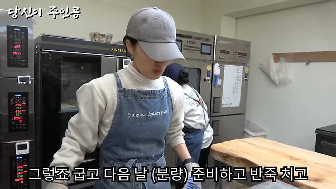 저는 둘째 대표인데요. 오후 6시 40분쯤에 와서 온종일 빵을 굽고, 다음날 분량을 준비하고, 반죽을 치 는 식으로 종일 만들고 있어요. 빵 굽는 게 실제로 아주 힘들어요. 들은 것보다 더 힘들어요.