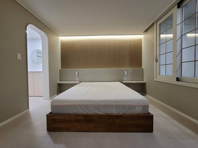 붙박이장을 없애고 침대 헤드를 제작하여 침실을 완성했어요. 템바 보드 위로 조명을 달고, 입구를 들어왔을 때 침대만 딱 보이게 구성했습니다. 힐튼 호텔에 방문했을 때 템바 보드로 인테리어가 되어있던 것을 보고 집에도 이런 침실을 만들고 싶다 생각했어요.