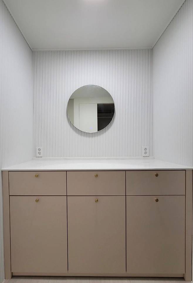 화장대 역시 흰 템바 보드로 통일해 주고, 중간의 거울은 조명이 들어오는 것으로 설치했습니다. 이 공간 반대편에는 원래 화장대가 있었지만, 수납공간을 늘리고자 드레스룸으로 만들었습니다.