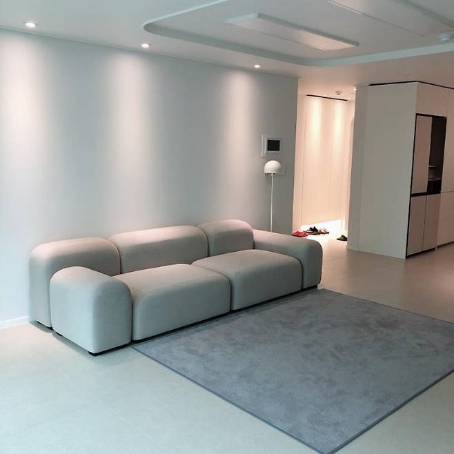 소파는 잭슨 카멜레온에서 구매했습니다. 조약돌 같은 모양이 너무 예쁘더라고요. 살짝 회색빛이 도는데 거기에 맞춰 그레이 러그도 깔아줬어요.