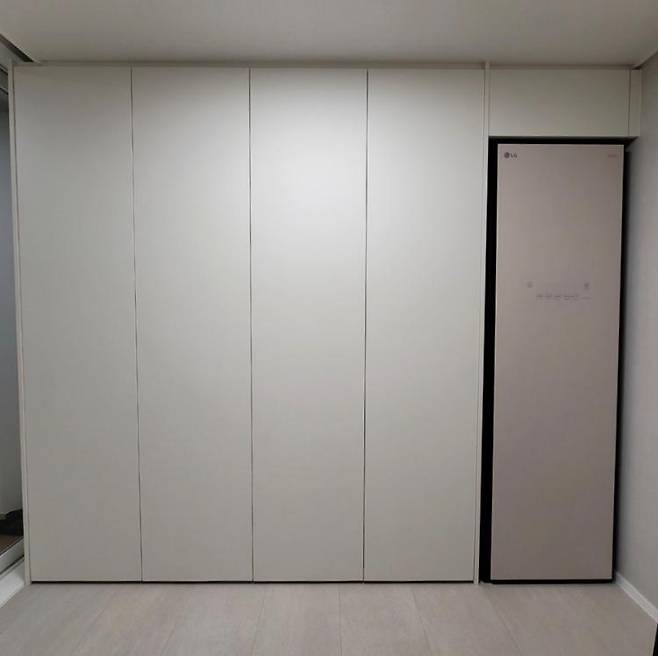 작은방이라 최대한 넓어 보이게 쓰고 싶어 한 쪽에는 붙박이장으로 오브제 스타일러랑 크기를 맞췄어요. 문도 터치형이라 손잡이가 없어 더욱 깔끔합니다.