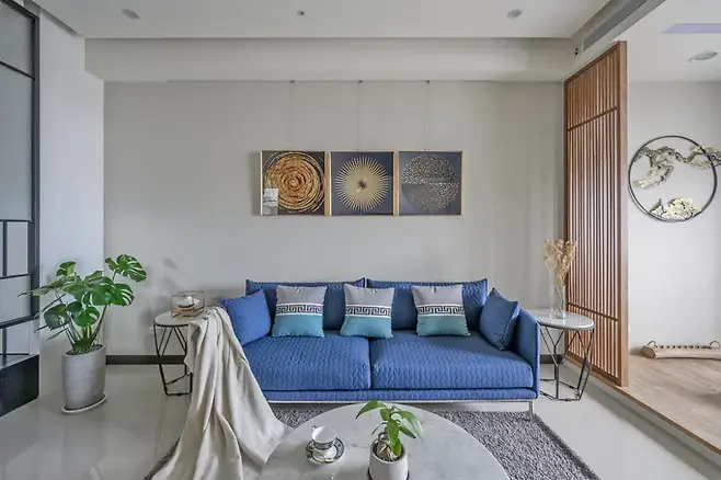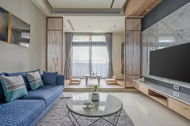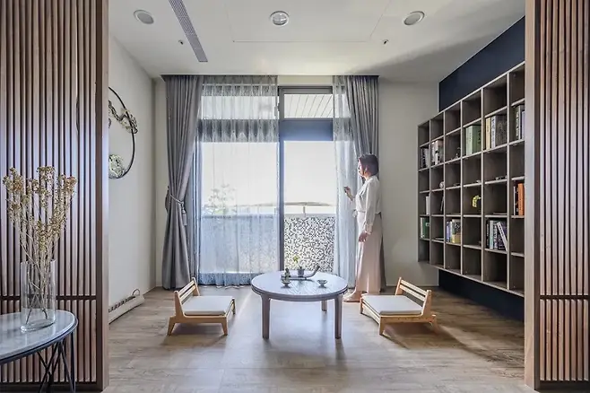 거실 끝에는 불과 2.2평의 공간이지만, 가장 큰 인테리어 임팩트를 주는 和 스타일 서재가 자리 잡고 있다. 채광이 좋은 창가 쪽에 자리한 이 방은 12cm 높이의 호두나무 마루를 통해 조금 높여져 있고, 양옆으로는 고정 격자 패널이 자연스럽게 시선을 유도한다.