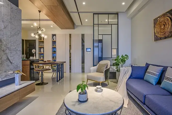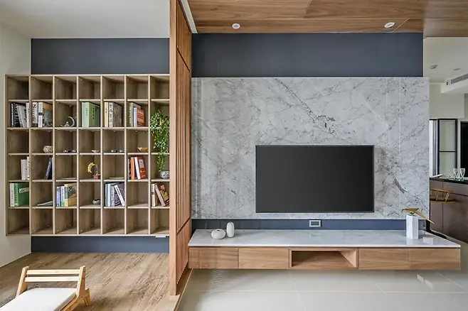 벽면의 TV월은 집주인이 선택한 천연 대리석으로 마감돼 고급스러움을 더하고, 상부에는 딥그레이 페인트 면을 남겨 시선을 위로 유도함으로써 공간의 높이를 강조한다. 얇게 파인 수직 그루브와 플로팅 형태의 수납장이 맞물려 입체적인 효과를 주는 것도 포인트다.
