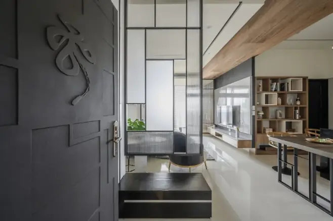분리된 문 없이 오픈된 구조지만, 반투명한 패턴의 샌드블라스트 유리로 시선을 조절했다. 여기에 블랙으로 염색한 이동형 목재 수납장이 무게감을 더하며 시각적 중심을 잡아준다. 이 수납장은 단순한 신발장이 아니라, 앉아서 신을 수 있는 벤치처럼 활용도 높은 가구로 설계되었다.