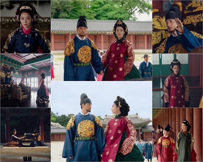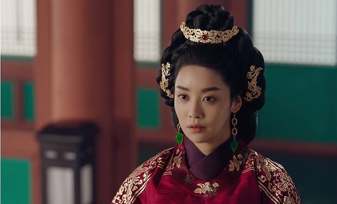 왕비 원삼: 붉은색 원삼을 착용하며, 봉황 무늬가 수놓아짐.