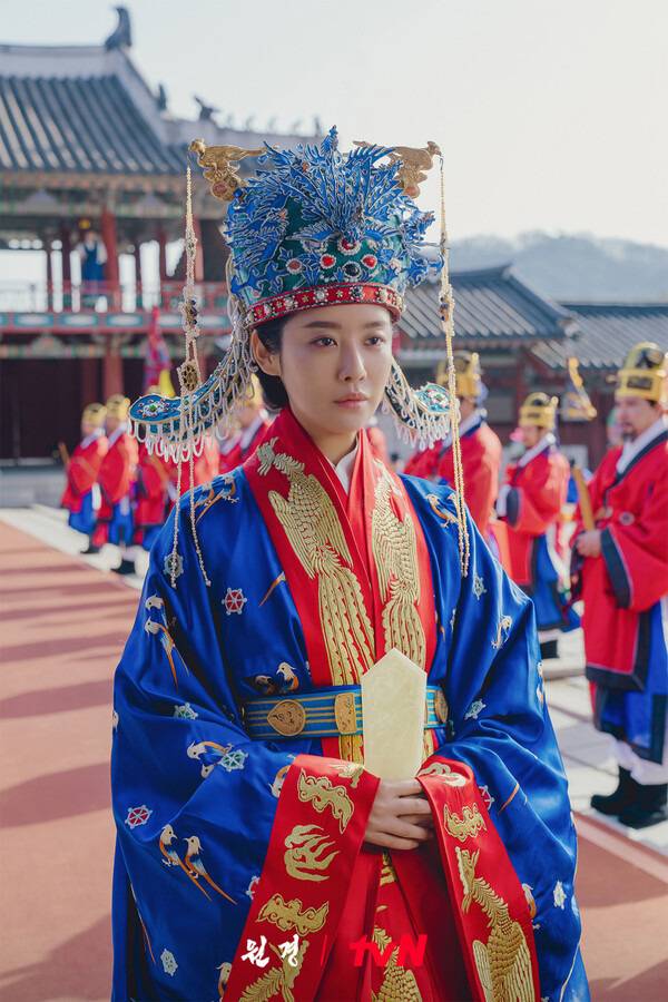 왕비의 대례복: **적의(翟衣, 붉은색 비단으로 만든 긴 겉옷)**를 착용. 봉황과 모란 문양이 수놓아져 있으며, 깃과 소매에 오색 선을 더함.