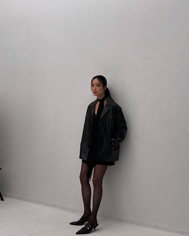 검은색 오버사이즈 재킷과 미니 드레스로 구성된 올블랙 룩으로 강렬하고 시크한 매력을 발산하고 있다. 미니멀한 디자인의 의상들로 모던하고 세련된 분위기를 완성하며, 블랙 컬러의 파워풀한 매력을 극대화하고 있다.