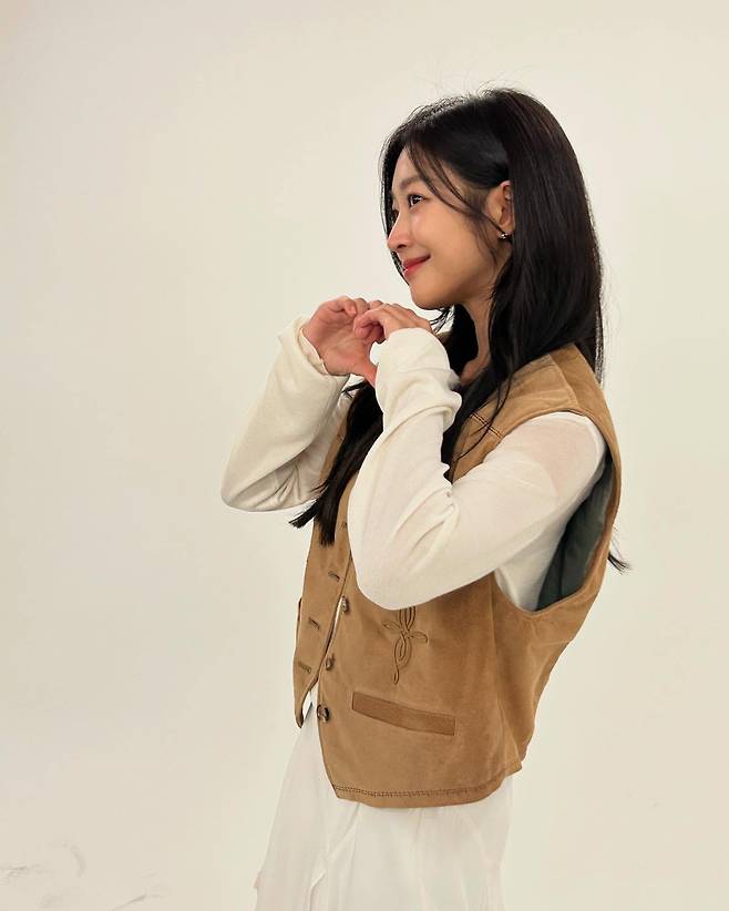 화이트 셔츠 위에 베이지 베스트를 레이어드하여 트렌디한 캐주얼 스타일을 연출하고 있다. 클래식한 베스트 디자인에 모던한 감각을 더해 젊고 활기찬 이미지를 표현하며, 편안하면서도 스타일리시한 데일리 패션의 완성도를 높이고 있다.
