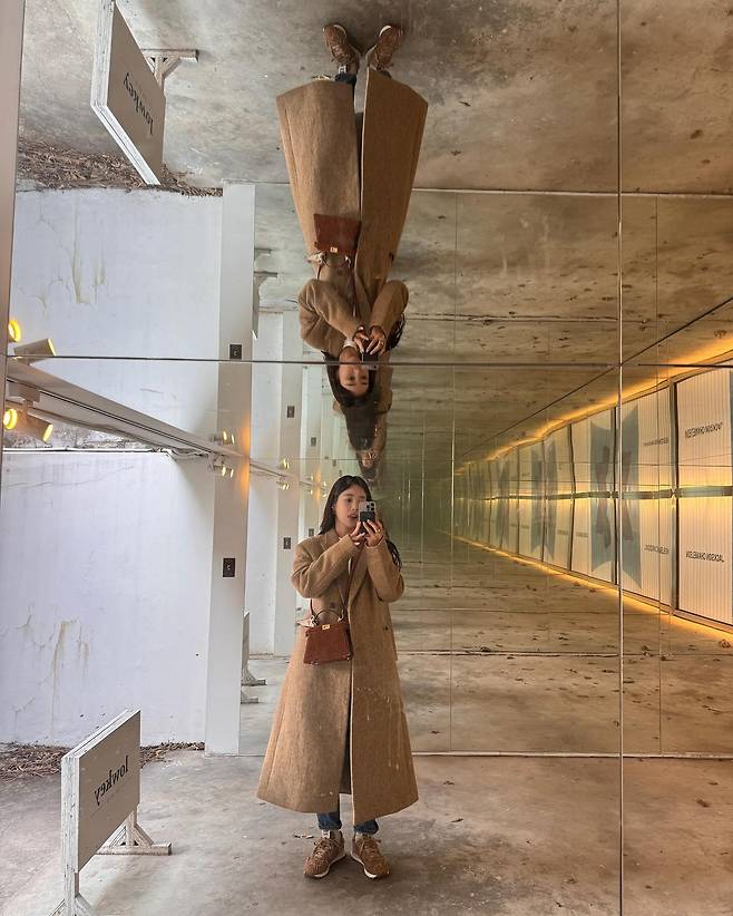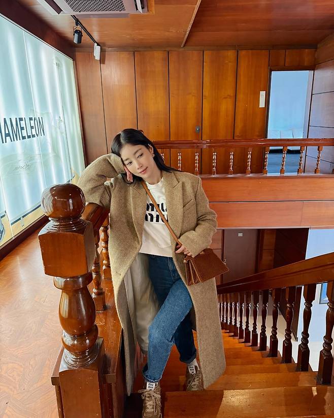 사진 속 기은세는 캐주얼한 롱코트 패션을 선보였는데요.