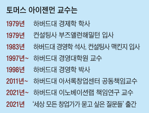 아이젠먼 교수는 ‘스타트업 실패 수업’으로 유명하다. 재작년 그는 실패한 스타트업의 패턴과 이를 피하기 위한 가이드를 담은 책 ‘세상 모든 창업가가 묻고 싶은 질문들(원제 Why Startups Fail)’을 펴냈다.