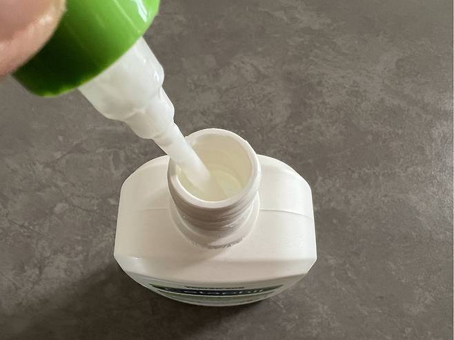 한참 세워두면 안에 남아 있는 로션이 아래로 떨어집니다.