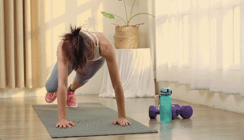 매트에 엎드려 플랭크 기본자세로 시작합니다. 오른쪽 팔꿈치와 왼쪽 팔꿈치를 차례로 구부려 팔꿈치 플랭크 자세를 만듭니다. 다시 팔꿈치를 차례대로 펴 원래 자세로 돌아오며, 이 동작을 반복합니다.
