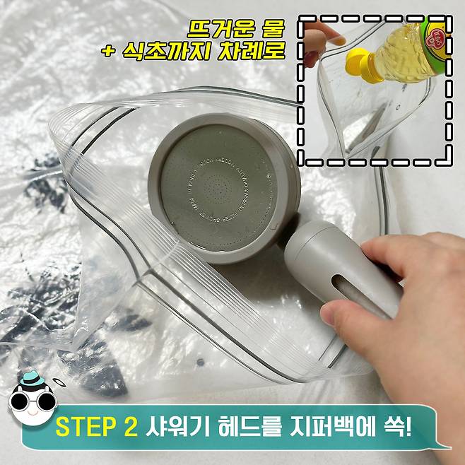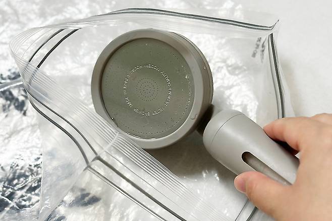 지퍼백에 샤워기 헤드를 넣은 뒤, 뜨거운 물과 식초를 충분히 넣어주세요