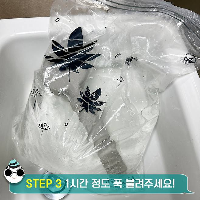 여기서 포인트는 지퍼백에 샤워기 헤드가 푹 잠길 정도로 뜨거운 물과 식초를 가득 넣어주기. 묵은 때가 쏘옥 벗겨질 수 있도록요.
