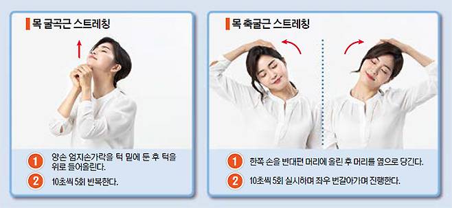 목 굴곡근과 축굴근 스트레칭도 배워둘 만하다. 양손 엄지손가락을 턱밑에 두고 턱을 위로 들어올린 후 10초간 유지하고 푸는 형식이다. 축굴근 동작은 머리를 좌우로 당겨준다. 방법은 간단하다. 오른쪽 손을 반대편 머리에 놓은 다음 오른쪽으로 10초간 끌어준다. 왼쪽도 같은 방식으로 진행한다.