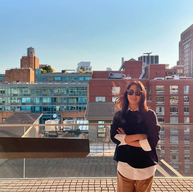 첫 번째 사진에서 김희선은 도시적인 배경 속에서 편안하면서도 세련된 캐주얼 룩을 연출하고 있다. 검은색 니트와 베이지색 바지의 조합으로 모노톤 컬러 블로킹을 완성했으며, 선글라스를 착용해 도시적인 시크함을 더하고 있다. 팔짱을 낀 포즈로 자신감 넘치는 모습을 보여주며, 고층 건물들이 배경인 루프탑에서 어반 시크한 매력을 발산하고 있다.
