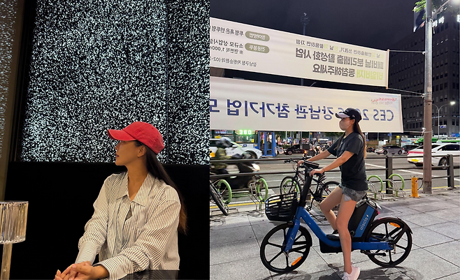 세 번째 사진에서는 공유 자전거를 활용한 스포티한 룩을 연출하고 있다. 검은색 티셔츠와 반바지, 스니커즈의 조합으로 캐주얼 스포츠웨어 스타일을 완성했으며, 야간 도심 속에서 활동적인 모습을 보여주고 있다. 마스크와 캡을 착용해 실용성과 스타일을 동시에 고려한 코디를 선보이고 있다.