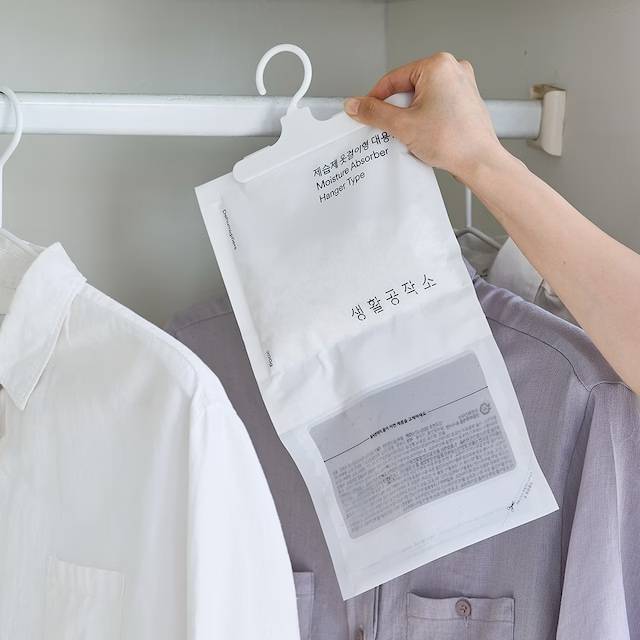 이럴 때 사용하면 좋은 것이 옷걸이형 제습제예요. 옷과 함께 걸어두는 형태로, 옷장 내부의 전반적인 습도뿐만 아니라 옷 하나하나의 습기까지 잡아줄 수 있어 유용하답니다.