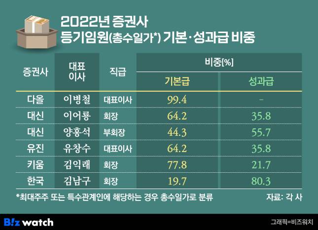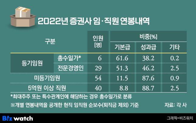금융투자업 특성상 증권사의 고액연봉자들은 대체로 기본급보단 성과급 비중이 높다. 하지만 예외는 있다. 등기임원, 그 중에서도 총수일가는 달랐다.