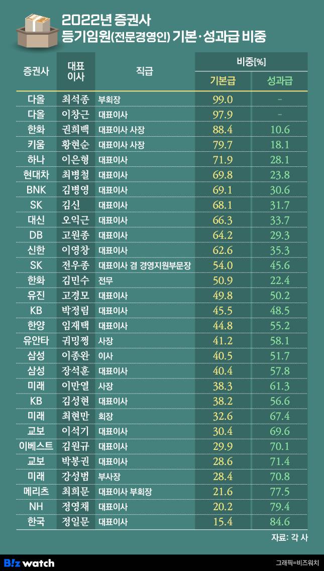 지난해 부동산PF 자금조달 위기로 성과급을 지급하지 않아 기본급 위주로 연봉을 수령한 다올투자증권의 최석종 부회장과 이창근 대표이사 사장을 제외하면, 권희백 한화투자증권 대표이사 사장(현 한화자산운용 사장)이 전문경영인 등기임원 가운데 기본급 비중이 가장 높았다.