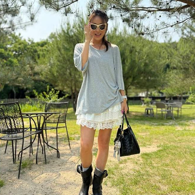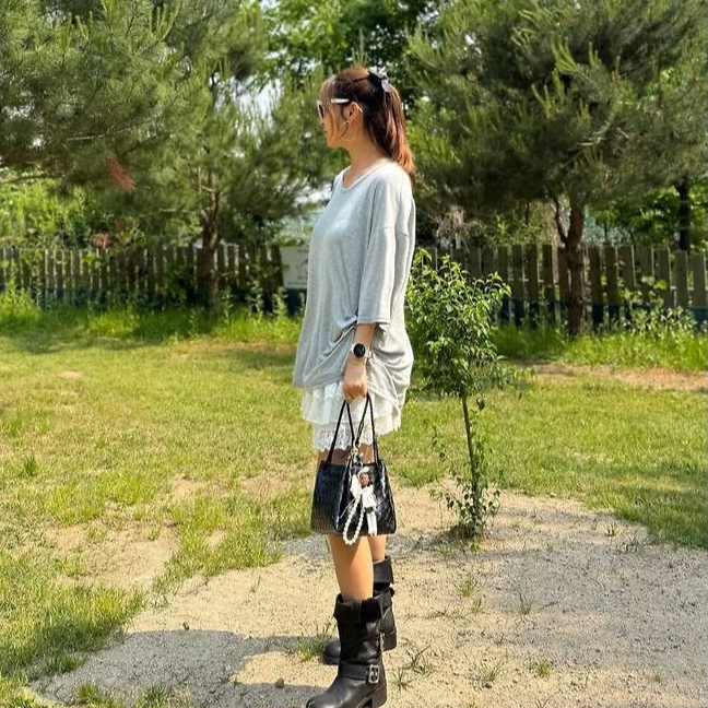 루즈핏 그레이 티셔츠에 레이스 포인트가 살아있는 화이트 미니 스커트를 매치해 발랄하면서도 우아한 무드를 자아냈습니다.