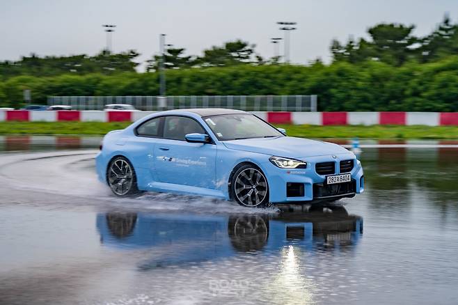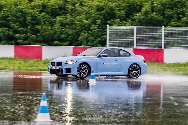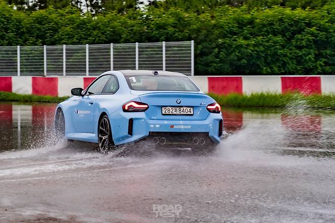 이어서 드리프트 코스로 이동했다. 물을 뿌려 마찰력을 낮춘 아스팔트 위에서 드리프트의 기초를 연습할 수 있는 장소다. 이번 파트너는 M2. 오직 뒷바퀴로만 460마력을 쏟아내는 M 라인업의 화끈한 막내다. 차체를 휘두르기 위해선 몇 가지 준비가 필요하다. 일단 시동 버튼 하단 ‘M 모드’ 버튼을 누르고 자세제어장치를 완전히 꺼야 한다(DSC OFF).