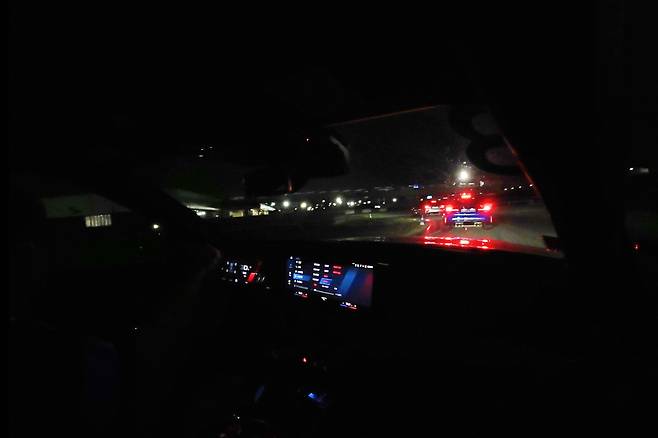 야간 트랙 주행은 예상보다 훨씬 까다로웠다. 길을 비추는 가로등은 생각보다 간격이 일정하지 않았다. 총 4대가 좁은 간격을 유지하며 달린 탓에 헤드램프 빛으로 시야를 확보할 수도 없었다. 가장 힘든 부분은 코너마다 놓인 라바콘의 위치 파악. 색깔별로 제동 시점과 코너 끝지점 등을 의미하는데, 트랙을 완전히 외우기 전까진 라바콘 의존도가 높을 수밖에 없다.