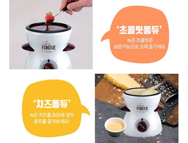 가정용 퐁듀메이커 역시 생각보다 부피가 작고 저렴하다. 시중에 파는 초콜릿이나 치즈를 사용해도 무방하지만, 초콜릿과 치즈는 녹는 점이 다르기 때문에 치즈는 강판에 갈거나 전자렌지에 녹여 액상으로 만든 뒤 퐁듀 메이커를 활용해 식지 않게 해주면 된다. 온도는 보온, 녹임 두 단계로 조절이 가능하며 포트가 뜨겁지 않아 아이들과 함께 사용하더도 안전 사고 위험이 적다.