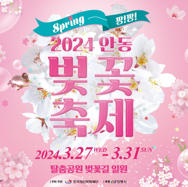 탈춤공연, 놀이동산, 농특산물 체험 및 한복 대여까지 다양한 프로그램을 만날 수 있는 2024 안동벚꽃축제. 아이들과 함께할 수 있는 ‘버찌 운동회’는 3월 30일(토)~ 3월 31일(일) 진행될 예정으로 제기차기, 사격대회, 팽이치기, 단체줄넘기 등 다양한 경기를 즐길 수 있다고 해.