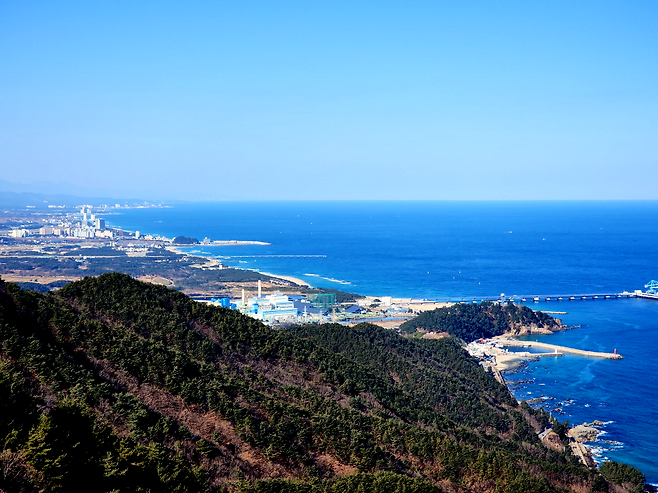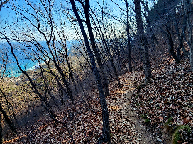 해변을 지나면 본격적으로 고도를 올리는 구간이 시작됩니다. 183 고지를 지나 괘방산 등산로로 접어드는 중·후반부는 이 코스의 핵심이자 가장 힘든 구간입니다. 겨울에는 낙엽이 정리되어 시야가 트여 있고, 나무 사이로 보이는 동해 조망이 더욱 또렷합니다. 그래서 힘은 들지만 멈춰 서게 되는 순간이 잦습니다.