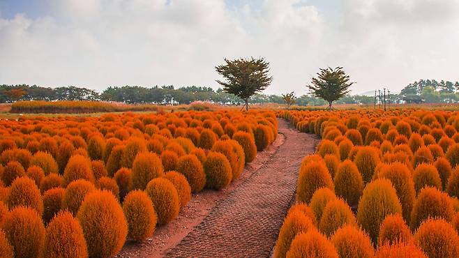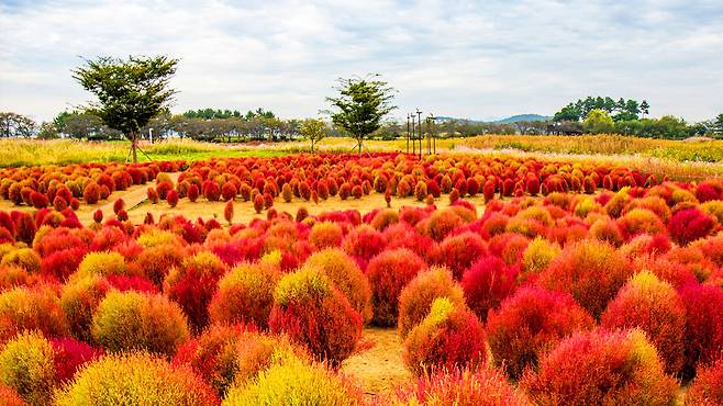 🔥 댑싸리(코키아): 초록빛으로 자라다가 9월 말부터 선홍빛으로 불붙듯 물들어 산책로를 따라 장관을 이룹니다.